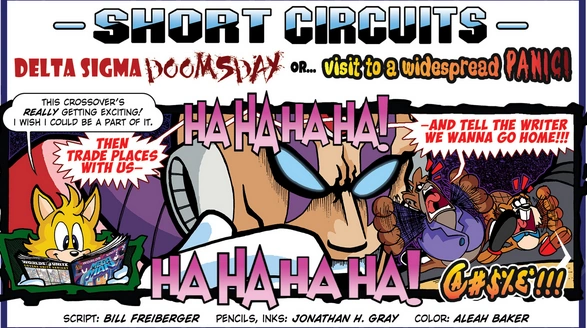One of the readers is reading the latest issue of Worlds Unite, comments how exciting it is, and wishes to be a part of it. Comedy Chimp tells him to trade places with him and Fastidious Beaver and tell the writer to take them home, as they run away from Sigma.