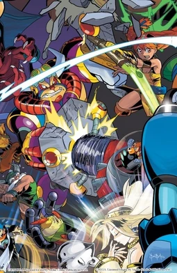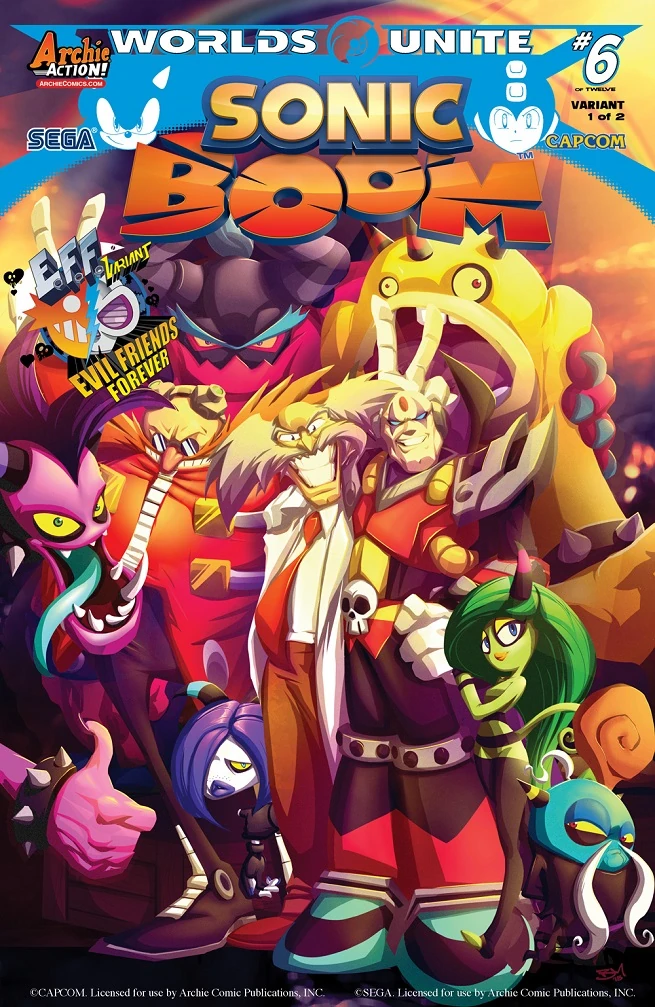 The SONIC/MEGA MAN crossover event GOES BOOM! "Worlds Unite" Part Six: The war against Sigma has been waged! Sonic, Mega Man and X lead their unified friends against hordes of Mechaniloids led by the armored, super-powered Deadly Six! That sounds pretty scary and exciting, and now is definitely the time for everyone to work together and pay close attention. Especially Sticks. She tends to do some distracting stuff, like falling off the Sky Patrol and landing into a Genesis Portal or something—wait? Did she really? Well, where did she land? No way! Is that - -?! You won't believe where Sticks lands, but what you BETTER believe is that this issue sports some awesome cover art by Patrick "SPAZ" Spaziante and the return of the EVIL FRIENDS FOREVER (E.F.F.) variant by Brent McCarthy! Plus part 6 of the epic 12-part connecting variant cover series by artist Ben Bates!