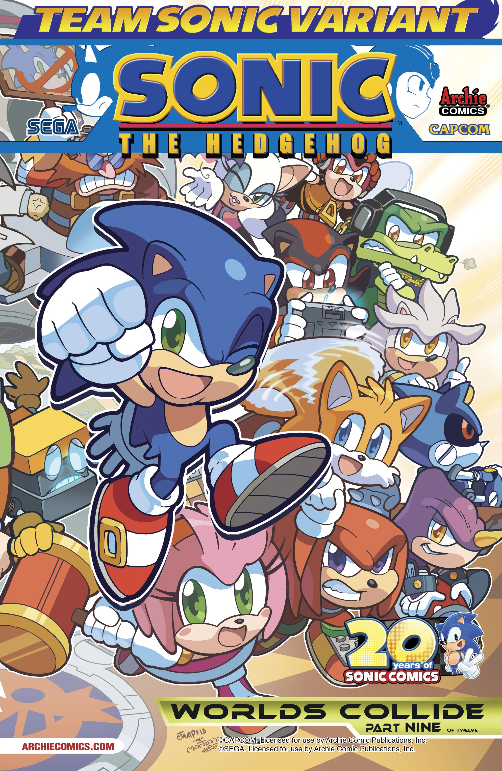 - The variant covers for this issue is a third set of "Team Mega Man" and "Team Sonic" variants, featuring the characters in a chibi-style, similar to that of the game Mega Man: POWERED-UP. The Mega Man cover exclusively features several characters from Mega Man, while the Sonic cover features only Sonic characters respectively. The two covers appear to join together to create a full image. Both covers are standard sized, compared to the wraparound main cover. Both covers are drawn by Mega Man comic regular Ryan Jampole.