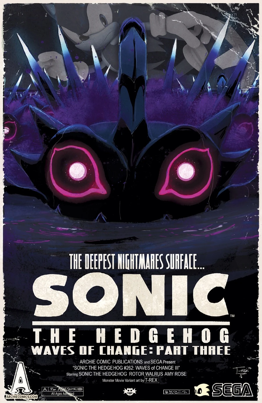 Catch some sun and ride the wave as the aquatic adventure continues in 'Waves of Change', Part 3! Sonic faces a city invasion by the ominous Dark Gaia Monsters! To make it even worse, the invasion is underwater - and Sonic can't swim! As the struggle turns desperate, will it be Amy's mission to find the key to saving them all, or will Sonic be left to drown? Then, in 'Light in the Dark', the Freedom Fighters find what they're looking for - but will their own divisions bring them down? Featuring new cover art from Ben Bates and an extra-special 'monster movie' variant from artist T.REX!
