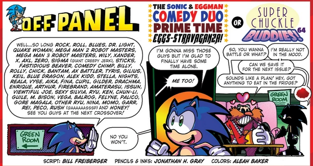 - In the Off-Panel, Sonic name-drops all of the Mega Man characters who appeared in the crossover, as well as all the other SEGA and Capcom characters, and Sticks the Badger, Fastidious Beaver and Comedy Chimp.