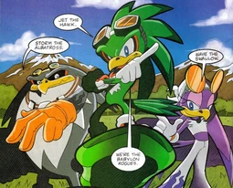 The Babylon Rogues became temporarily employed by Dr. Eggman after Jet stole a vapor accelerator from the doctor to boost his Extreme Gear. He was captured and brought before Eggman, who was intrigued by his speed on his Extreme Gear, remarking that Jet was nearly as fast as Sonic the Hedgehog with it. When Jet claimed he heard of the "poseur" and boasted about his own speed, Eggman offered to free Jet if he would in exchange rough up Sonic. Jet agreed, provided he could bring along Wave and Storm. The trio entered the Great Forest not far from Freedom HQ and activated the security system to lure Sonic to them, and attacked him when he arrived. Despite Sonic's speed, being outnumbered and attacked by enemies using Extreme Gear proved too much for him to handle. (StH: #163)