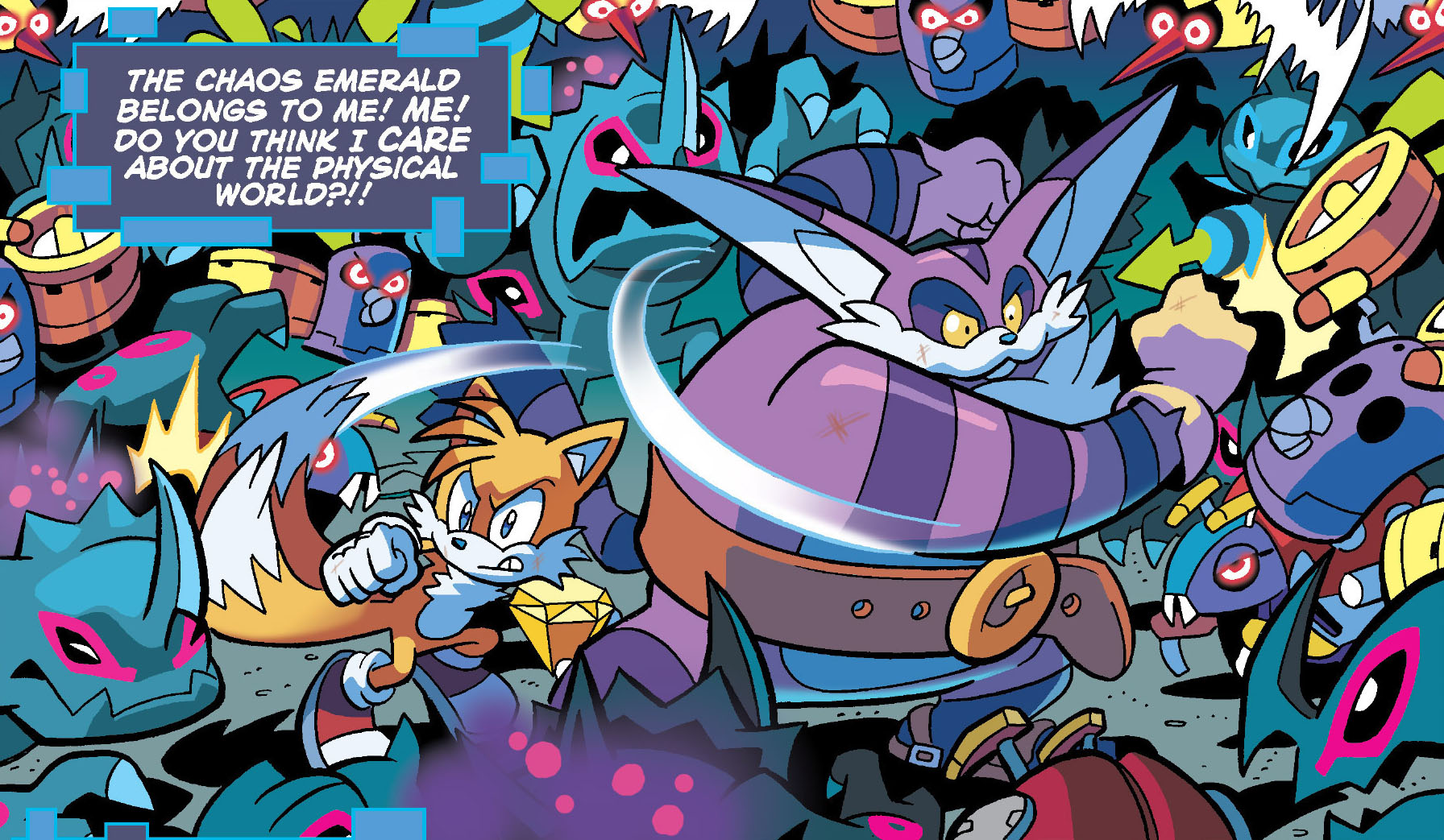 During a typical day of fishing in the Mystic Ruins jungle, Sonic and Tails arrived to look for Rotor and the Sky Patrol. The duo (who had recently returned from the Super Genesis Wave with memories of a different timeline) were puzzled as to why Big was back at his old home and not in Mobotropolis, to which the cat was clueless. Nonetheless, Big was more than happy to help his friends locate Rotor, and ended up running into Rotor's attempt to stop a horde of Badniks. Ultimately, Big showed he still had a heroic bone in his body by fighting off Silver Sonic and protecting Sky Patrol, the cat opting to stick around afterwards. (StH: #253) He was later present on Sky Patrol when Sonic retrieved Amy Rose and Sally and had a front row seat to the destruction of the planet. (StH: #256)