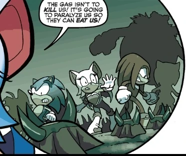 Eclipse's ship subsequently crash-landed on Angel Island, where all but four of the Dark Arms eggs were destroyed. These four hatched into Blurk, Cregal, Cyzer, and Rhygenta, and Eclipse soon set out to grow fruit to feed them. Seeking a better means of nourishing them, he set out to claim the Master Emerald when Team Dark arrived in search of him. He engaged Shadow in battle and gained the upper hand with his monster form, until the Ultimate Lieform used the Master Emerald to perform Chaos Control. Defeated, Eclipse fled and returned to the ship, where he found the Dark Arms safely unharmed. To his surprise, they expressed their desire to help him, and the five of them attacked Shrine Isle while Shadow was occupied battling Knuckles the Echidna over custody of the Emerald. They managed to secure the stone by combining their powers, and made their way towards Team Dark's craft. Unfortunately, after fighting through various defenses, they ran into Shadow and Knuckles, who had put aside their feud. The ensuing battle resulted in the Master Emerald being shattered and scattered across the planet by Knuckles, but Eclipse and the Dark Arms managed to escape to the surface. (SU: #65, #67, #68, #69, #70)