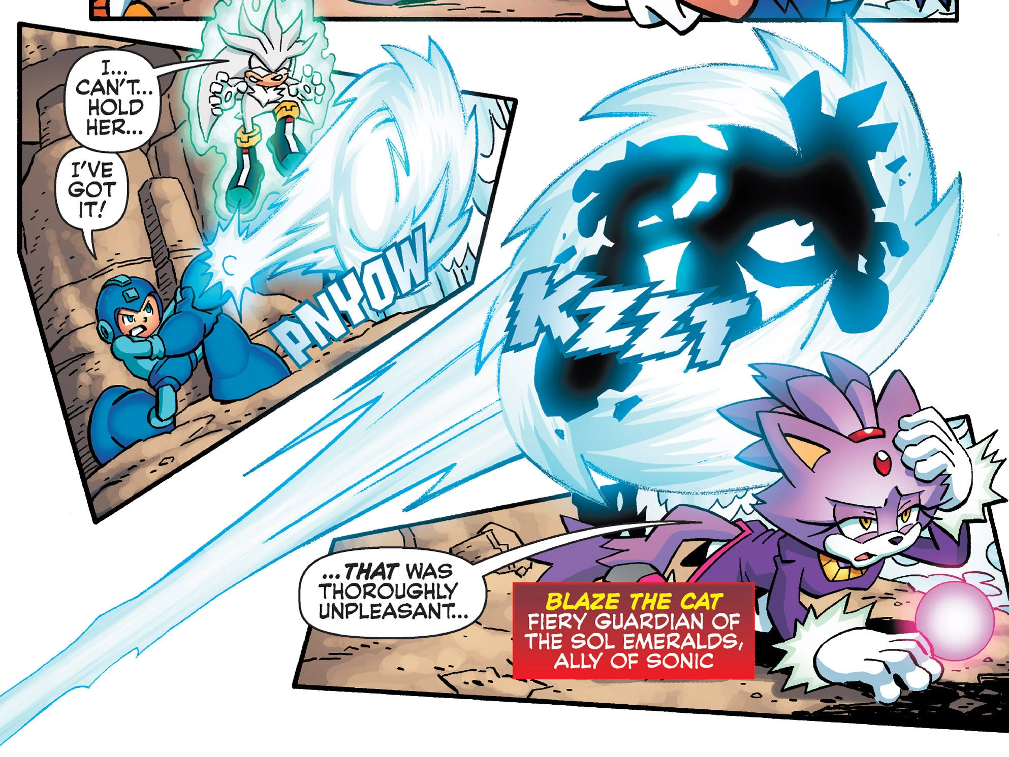 Following Shadow Man's restoration, Blaze Woman and her partner were sent to engage the heroes as well. Blaze Woman ended up battling Sonic and Tails, who were at a loss as to how they could counter her fire powers. Help arrived in the form of Mega Man and a restored Silver, who used his psychic powers to hold the Roboticized Master long enough for Mega Man to return her to her organic form. (MM: #26)