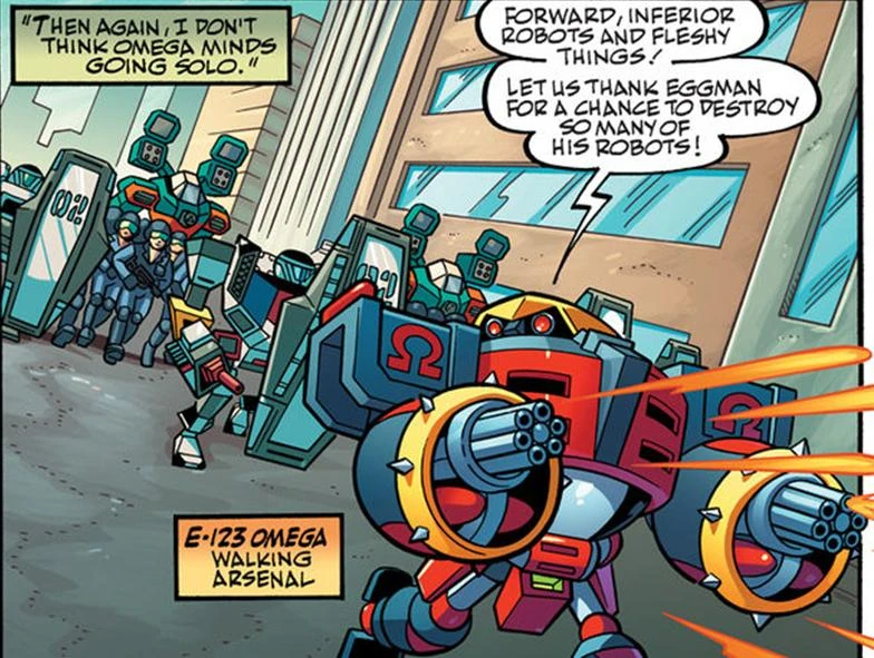 Omega leading G.U.N. troops against the Eggman Empire's attack.