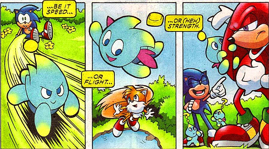 Chao tend to take on the characteristics of beings whom they spend time around. For example, a trio of Chao-dubbed Chronic, Chails, and Chuckles-gained super speed, enhanced flight, and super strength after spending time with Sonic the Hedgehog, Miles "Tails" Prower, and Knuckles the Echidna. Another Chao became friendly with Jules Hedgehog, and took on Robian qualities. Chao can also become attached to individuals, as evidenced by the friendship between Cream the Rabbit and her Chao, Cheese. (StH: #173, CSE)