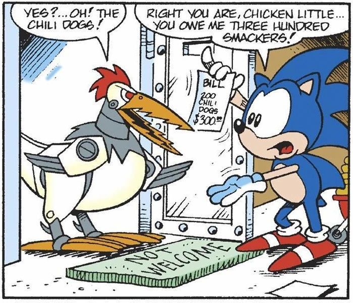 When Sonic went to deliver two-hundred chili dogs to Robotnik, Inc., Cluck answered the door, not expecting Sonic to actually deliver the chili dogs. He proceeded to slam the door in Sonic's face and attempted to drop a checkered wrecking ball on him, but missed. (OSM: #0)
