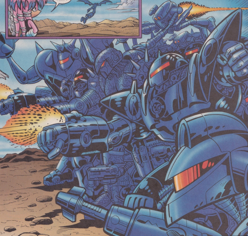 Some time later, a second wave was built to guard the now crippled city of Robotropolis, its defenses damaged by a recent earthquake. These Combots had an unusual fuel that can cause a catastrophic explosion when the Combot is struck by lightning. When Sonic was caught in one such explosion, the chemical reaction caused Sonic to lose his speed, allowing Robotnik's Combots to capture the Freedom Fighters, minus Sonic, who had to dive into a lake to avoid another explosion, causing the Combots to think he had perished. The eventual Substitute Freedom Fighters rescued Sonic, and helped him break into Robotnik's base, distracting the Combots long enough to get the Power Rings needed to regain his speed and finish the Combots off. (StH: #38)