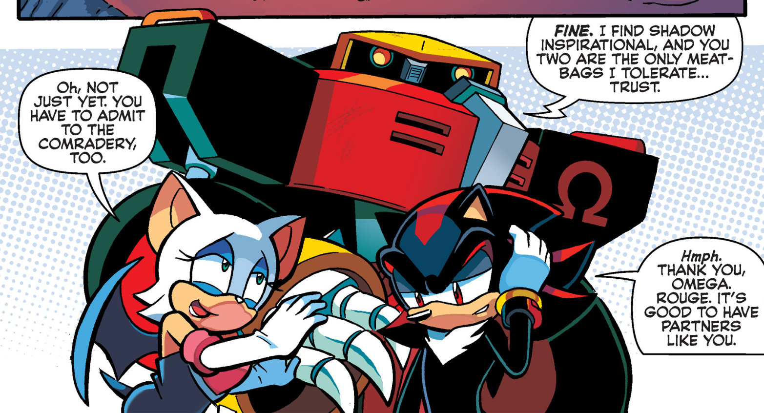 After an intense skirmish, Rouge and Omega helped their friend regain his senses, and he departed to challenge Black Death while Rouge and Omega faced off with Eclipse to save Spider Troupe. The battle proved difficult, and even Omega was hard-pressed when Eclipse transformed into a monstrous version of himself and attacked. However, his stamina ran out quickly, and he was dragged from the battle by Death's Eye. With Black Death destroyed, the G.U.N. forces planted the explosive they had been instructed to deliver and destroyed the comet. However, Dr. Julian Snively of G.U.N. quickly determined that a vessel containing Eclipse and his Dark Arms had escaped the comet's demise and landed on Angel Island. As such, Omega and his teammates traveled there in a G.U.N. shuttle accompanied by Snively's tele-pod, and made their way through several of the island's Zones to reach Shrine Isle and Knuckles the Echidna. On Rouge's suggestion, she and Omega joined Knuckles in searching for Eclipse while Shadow remained behind to guard the Master Emerald. (SU: #61, #62, #67)