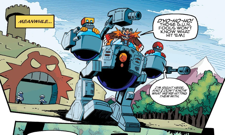 In the wake of the Super Genesis Wave, Eggman found the Eurish Egg Army fending off an attack by G.U.N. troops deployed from a nearby aircraft carrier. A frazzled Hood tries to explain to his master that they've been tied up in the conflict for months with Bow Sparrow and his group and the G.U.N. forces took them by surprise. Eggman tells Hood to stop with the excuses and handles the G.U.N. troops himself. (StH: (#254)