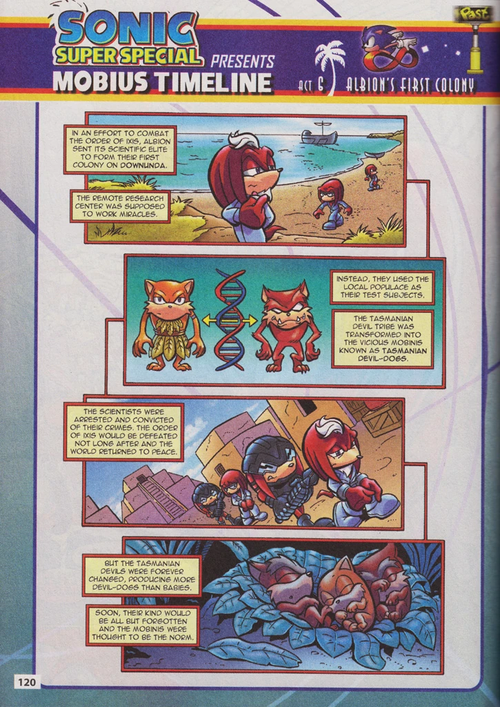 The Order of Ixis was defeated shortly after the colony was disbanded, but the Tasmanian Devils' gene pool was permanently altered, with most infants born to the tribe being Devil-Dogs rather than babies. Over time the Devils were reduced to a population of just two Mobians, while all others were mutants. The remaining Devils passed down stories of how the Echidnas were to blame for the crimes, and eventually one of the last of their line named Thrash the Devil avenged the fall of his people by banishing most Echidnas from Mobius. (CSE, StH: #244)