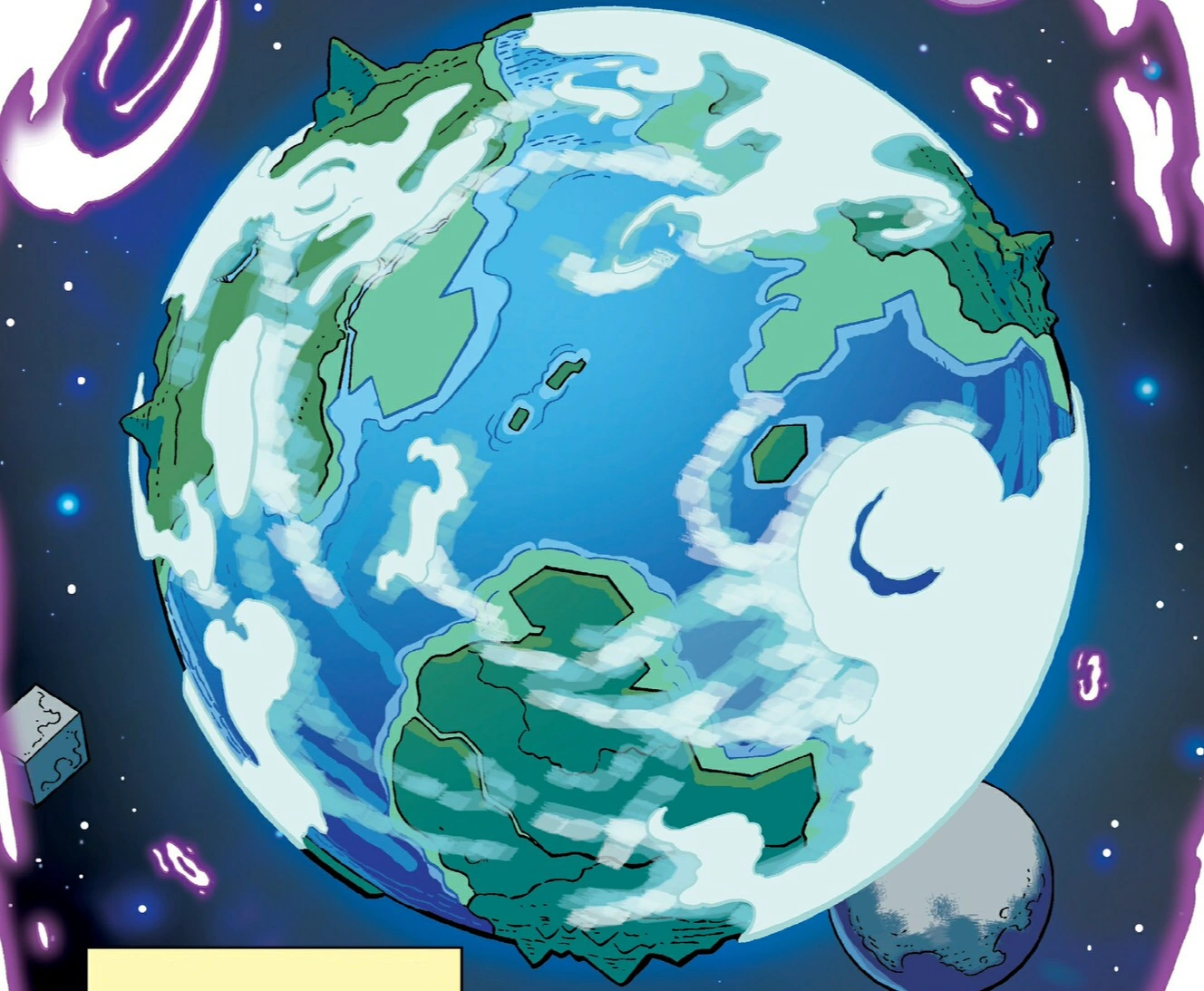 The Genesis Nexus is a world that connects all the worlds linked by Genesis Portals whose existence was first theorized by Sticks the Badger. The world is Earth-like, surrounded by varying geometric moons/planetoids and Genesis portals in space. (MM: #52)