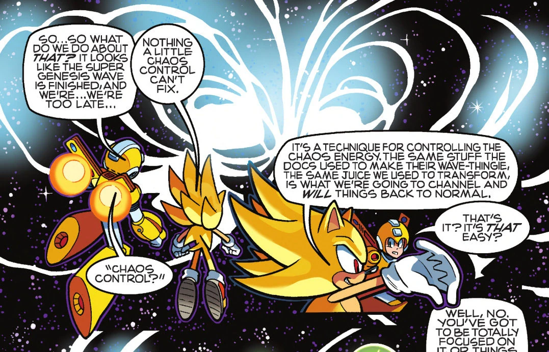With both of their realities under the influence of the second wave, Doctors Eggman and Wily prepared to initiate a super-powered version of the wave, aptly named the Super Genesis Wave, once they'd collected all seven Chaos Emeralds, to alter the realities further, this time completely reshaping their worlds to their exact vision with no limitations, despite the risk of heavily damaging the fabric of space and time in the process. Sonic and Mega Man were unable to prevent the wave from being unleashed on this already changed world, but they were still able to infiltrate the wave while in their Super Forms, in which they attempted to reverse the wave with Chaos Control. Super Mega Man was able to successfully restore his world, with everybody native to his world returning to their correct time and place in reality. Super Sonic's attempt at restoring his world, on the other hand, was met with interference by Eggman, which resulted in their world being restored but with disastrous consequences... (SU: #54, StH: #251)