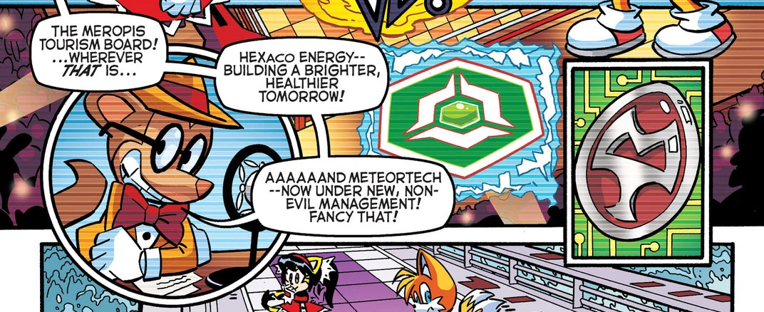 HEXAeco is an energy company known to have facilities in Grand Metropolis, which were briefly seized by Metal Sonic while he was impersonating Dr. Eggman as head of the Eggman Empire. Team Sonic, Team Dark, Team Chaotix, and Team Rose all passed through HEXAeco facilities during their efforts to stop the villainous robot. Later, during the Shattered World Crisis, HEXAeco would step up as a sponsor for Breezie the Hedgehog's Chaos Emerald Championship, along with the Meropis Tourism Board and MeteorTech. (VG: SH, StH: #269)