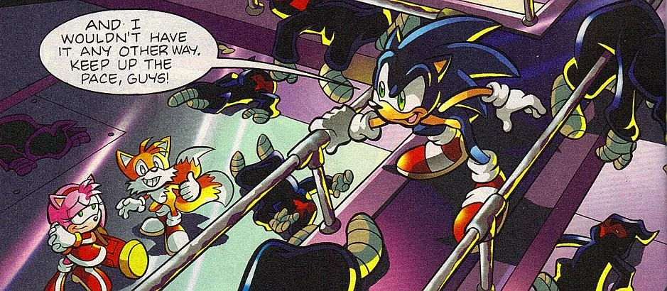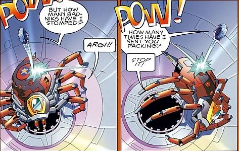 After they had set up a link to New Mobotropolis, the Chaotix and Freedom Fighters started their assault. At the same time, Lien-Da ordered the Legion to begin their defense and work on the barricade. Mighty and Bunnie then broke open the front door and the Freedom Fighters took to the West hall while the Chaotix took to the East hall. After both teams defeated the Legion, they met up at the barricade. After a brief conversation, Sonic spin-dashed to meet Dr. Eggman in his Egg Tarantula. After a brutal fight against his nemesis Sonic once more defeated him and destroyed his machine, declaring victory, at that point Eggman lost his last hold on sanity and the heroes went home happy that the tyrant was defeated, though Sonic felt shaken by what had happened to the Doctor. (StH: #199, #200)