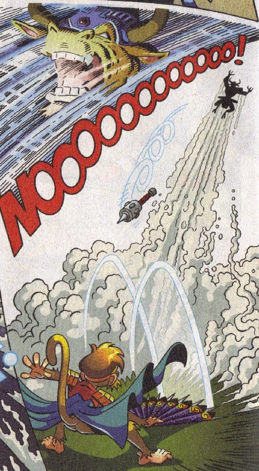 The Iron King was later part of the vast audience gathered to witness the Legionization of a number of prisoners, a ploy intended to lure in members of the resistance. Bored by having to watch the procedure instead of hunting down the rebels himself, he was soon appeased as Amy Rose, Antoine D'Coolette, and Geoffrey St. John charged in to save the captive Rotor Walrus and other prisoners. Though successful against Geoffrey, he found himself up against Amy yet again, her strength a match for his own. He was then caught off guard by the return of Sonic and his teammates from the Dragon Kingdom, with the Hedgehog knocking him off his feet and then speaking to Amy Rose while standing on top of him, much to the Iron King's indignation. Despite the advantage in numbers, the heroes had little chance of subduing the king until the timely appearance of Espio the Chameleon, who arrived bearing the Fan of Fen Xing, something the King had thought stored safely in his own armory. This visibly frightened the King, and with one wave of the fan, Monkey Khan sent the ox flying into the air and through the city's dome, something Sonic described as "reverse sky-diving." Where he landed is unknown, though Sonic did make mention of hearing about pleasant weather on the west coast before he was blown away. (StH: #210, #211)