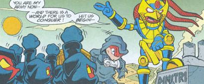 Despite this set back, Kragok remained determined, ordering that a statue of the great Dimitri be erected to inspire his men while they set up camp in the Sandopolis desert. The last thing Kragok anticipated was the return of Dimitri himself still in the form of Enerjak. Surrendering control of the Legion to his ancestor, Kragok followed Enerjak faithfully. After inspecting the Dark Legion troops to ensure they were prepared for the upcoming invasion of Echidnaopolis, Kragok spoke privately with Enerjak, who informed him he was setting out to deal with any major opposition. While Enerjak dealt with the Fire Ants and Knuckles, Kragok interviewed Julie-Su, who was returned to the legion by Enerjak. Due to Julie-Su's status as an outstanding and loyal soldier, Kragok believed her when she explained she was only using Knuckles to relocate the legion so she could return to its ranks. Before dismissing her however, Kragok warned her if he found out she was lying, a lot more than her "honor" would be at stake. Later when the captured Chaotix nearly escaped, Julie-Su managed to render them unconscious, at which point Kragok ordered her to finish them off. However, he was soon distracted when he was presented with the captured Archimedes and Deo Volente, whom he proceeded to place in a box and have buried beneath the sands of the desert. (KtE: #7, #8)