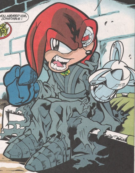 Kragok was a red echidna with a cybernetic left eye and arm. His one organic eye was blue, though it was on occasion colored brown. His mechanical arm ended in a ball joint with three sharp "fingers" spaced equally apart. He wore a dark gray Dark Legion robe with tattered sleeves and a green and gold clasp on the front; usually, his hood was kept up. On his right hand he wore a blue mitt-like glove, usually with the thumb free. In some appearances, his dreadlocks were drawn noticeably shorter than average in what was perceived by many fans as an attempt to further distinguish his appearance from that of Knuckles (it was around this time that his eye was brown rather than the common blue). Eventually, his mechanical arm was damaged and twisted. The character was designed by artist Patrick Spaziante.