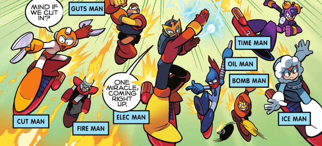 The Light Robot Masters later joined forces to help rebuild Light Labs, with Concrete Man joining the original line in the construction effort. Later, after Mega Man disappeared and Sonic Man began attacking Mega City, the original line was deployed to try and stop him. Unfortunately, Sonic Man proved too powerful for them to defeat, and Dr. Light was forced to call in a number of former Wily Robot Masters and Quake Woman in an effort to defeat the villain. Eventually these events would be erased from history, returning the Light Robot Masters to their place at Light Labs with no memories of the battles. (SU: #76; SB: #8; StH: #273; MM: #52)