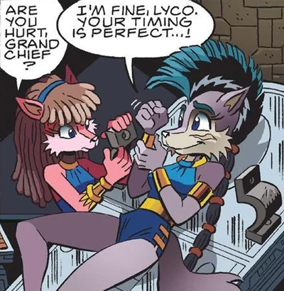 The scattered wolves were eventually resettled in the southern hemisphere, forming the new Wolf Pack Nation. When Lupe lead several armed wolves into the Mysterious Cat Country, Lyco was among them, brandishing a sword. She and her sister then followed Sonic and several of the Felidae people to the Mystic Ruins, where they engaged the resident Dark Egg Legion chapter. Upon removing the hood of one Legionnaire they had captured, Lyco was surprised to see the face of a Wolf who had been Leeta's ex-boyfriend and who had apparently gotten on the bad side of both sisters. Following the Wolf Pack victory, Lyco and her comrades welcomed Sonic the Hedgehog, Sally Acorn, and Big the Cat into the pack. (StH: #213, #214)