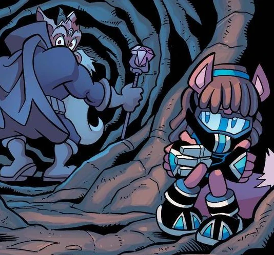 Lyco was given the call sign "Queen of Hearts," and she took action with taking down Eggman's ground forces during the invasion by the Death Egg. With their first mission together a success, she was soon assigned the mission of investigating Naugus' activities within a cavern below the city. Lyco, along with Leeta (Agent Queen of Diamonds) and Elias (Agent King), followed Naugus down a massive pit and into a series of caverns. Lyco wondered why it seemed like Naugus was talking to himself, and while she and her sister discussed this, they were rudely interrupted by Elias, who was setting a bomb for their later exit. Not appreciating his attitude and apparent lack of trust in his teammates, the two berated him and them set off after Naugus on their own. Using a compass, Lyco determined that Naugus seemed to have constructed an odd chamber directly below the Military HQ. As they pondered the chamber's purpose, Naugus suddenly transformed into a monstrous form; caught by surprise, Lyco shrieked, alerting Naugus to their presence. She and Leeta raced back through the cavern, telling Elias their cover had been blown. The three them realized that Naugus was using his magic to reshape the cavern around them in order to trap them. Trying to find an exit, the three split up. Leeta was cornered by Naugus and nearly captured, but Lyco caught his attention, allowing her sister to get free; Naugus was momentarily confused by the near-identical appearance of the two agents, and this gave Elias a moment to catch up and throw a flash-bang grenade. The three found a proper tunnel and used the bomb placed earlier to blow an escape route; they jumped out into the pit, again engaging their wing-suits. The monstrous Naugus sent a barrage of wind after them and, thinking that they had fallen to their deaths, returned to his chamber, confident his secrets were safe. (STH: #240, SU: #42)