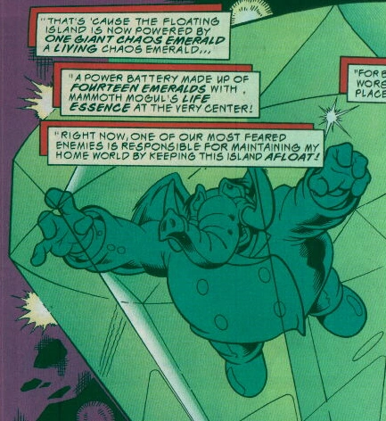 The second phase of Mogul's plan began when he freed Knuckles' ancestor Dimitri - who at that time went by the alias of Enerjak - from his exile in space and returned him to Mobius. During Enerjak's attack on Echidnaopolis, Mogul used the true Sword of Acorns to steal the power of eleven Chaos Emeralds that fueled Enerjak, gaining the practically nigh-omnipotent might of twelve Chaos Emeralds, while leaving Dimitri to die and sent Sonic, Knuckles, and Tails away into a pocket zone. He then underwent a super transformation into Master Mogul and claimed once again to be Mobius's ruler with plans to use the Triple Threat as new enforcers for his reign of terror. Despite his newfound strength, Mogul found himself challenged by the combined forces of Super Sonic, Turbo Tails, Hyper Knuckles, the Brotherhood of Guardians, the Ancient Walkers and Athair, forcing him to attempt to drain the power from the remaining two Chaos Emeralds on the island in a last ditch attempt to gain the upper hand. Despite successfully absorbing the energies of the other Chaos Emeralds, the Guardians Locke and Sabre used their own command of the Chaos Force to invert the power flow, and trapped Mammoth Mogul within the newly created Master Emerald, which was comprised of the 14 Chaos Emeralds Mogul had absorbed. Knuckles expressed his concerns about this, but could do nothing about it. (StH: #56, KtE: #9)