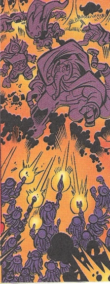 Mammoth Mogul made his return when the children of Arachne used the Sword of Acorns to cause a dimensional rift leading to the Zone of Silence in the Egg Grape Chambers, killing the Ancient Walkers and breaking their curse on Mogul's Emerald, while at the same time sending all previous prisoners of the chamber to the Zone. At the time, the gem was in Knothole, having been brought there as part of a plan to restore the Walkers' health and keep the villain imprisoned using the Artifacts of Acorn. With the curse gone, Mogul was able to free himself while Tails' uncle, the powerful wizard Merlin Prower was holding his emerald.(StH: #162)