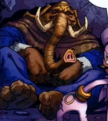 Mammoth Mogul appears as a large, brown-furred Mammoth with dark green eyes, which previously appeared black. Mogul's attire has varied throughout his history, beginning with a fur toga during his early life. He subsequently adopted a hooded robe while operating as leader of the Order of Ixis, and was seen in other historical attire in flashbacks. When transformed into Master Mogul, his attire has consisted of a suit of armor with a cape: gold armor with red upon his first transformation, and all green in the second.