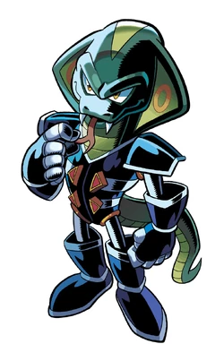 Lord Hood is a green Mobian snake with yellow markings on his head. He wears a black and red cybernetic-enhanced outfit through which his snake body is threaded through, outfitted with a mechanical torso and legs.