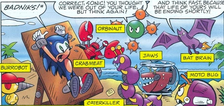 After Sonic being Roboticized and turned into Mecha Sonic. Motobug and the other badinks were decommissioned and sent to Robo Hobo Jungle. After Sonic was De-Roboticized and went to the jungle to arrest Nack the Weasel he and the other badniks attacked him but was quickly defeated. (StH: #40)