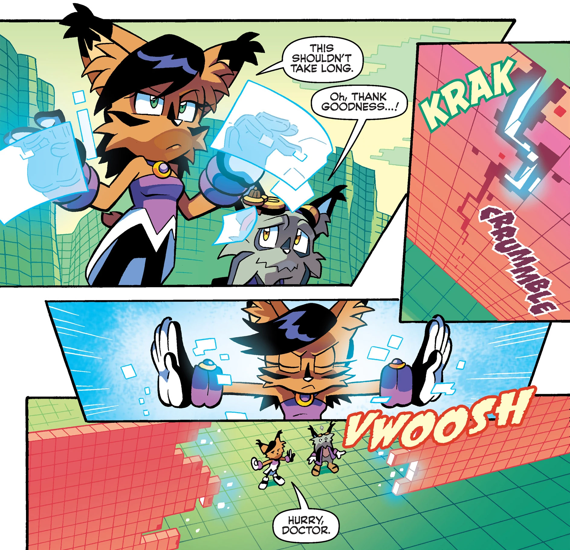 NICOLE continued to have impaired speech until they restored Antoine's memories outside Knothole. At that point, she found the lingering energy she possessed from the second Genesis Wave was waning. Her condition further improved when she restored the memories of Bunnie after recovering her from her mission in Metropolis Zone. Although her speech was restored, and she could partially project her lynx body again, NICOLE's database was still scrambled, limiting her usefulness for the time being. Seeing in particular Bunnie's reaction to the restoration, NICOLE expressed regret at what it was doing to the mental well-being of her friends. She also revealed she likely only had enough Genesis Wave energy for one more memory restoration, meaning Sonic would probably have to choose between restoring the memories of Sally or Amy. (StH: #254, #255)