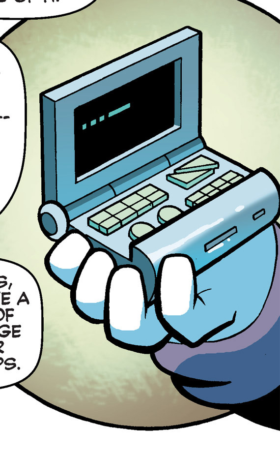 Nicole, Sally, Tails and Big returned to the Sky Patrol where they learned that GUN had acquired a Chaos Emerald in the Crystal Desert Zone. However, the camp was attacked by Metal Sonic and Nicole let Sally communicate with Rouge the Bat through the handheld. After Sonic's brief disappearance, Nicole's handheld projected the plans for the Freedom Fighters to find Sonic and look after the wounded soldiers. (SU: #75)