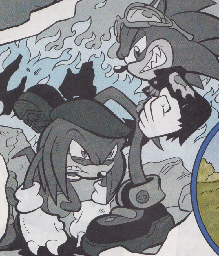 With the Knothole Freedom Fighters, both echidnas headed out to investigate the deterioration of the Sunken Island's giant air bubble, and discovered that it was the work of none other than Robotnik Prime, who was looking once again to obtain power through Chaos Emeralds, this time from Anti-Mobius. Eventually Robotnik opened a portal directly into the Chaos Chamber on Mobius Prime; while Sonic and Sally provided a distraction, Knuckles and Anti Knuckles ran to Angel Island's emerald and called out to the doctor. Thinking that, with the Sunken Island as a source he would no longer need to seek an emerald from Angel Island, he attempted to destroy it with his device; however, the echidnas repositioned the emerald to reflect the blast back, destroying the weapon and sending him back to Mobius Prime. Acting quickly, Anti Knuckles recovered what would later be known as Anarchy Beryl from the shattered weapon and placed them into slots in the wall, restoring the Sunken Island's air shield and saving it. He then returned the Freedom Fighters and Knuckles to land, though kept Evil Sonic tied up until after they returned to their home zone. (StH: #44)