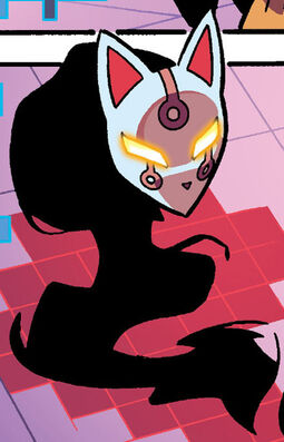 Phage's appears to wear a white feline mask with triangular ears that have red interiors, glowing yellow eyes, and a pink triangular nose. This mask is also marked by three red rings-one on each cheek and one on her forehead-that are connected to her eyes and the back of her head by three red lines. The rest of her body is an amorphous mass of black, capable of manifesting a mouth with incredibly sharp teeth. She can shape this mass to take on different forms, and briefly approximated Nicole's form. Phage's mask appears to lose structural integrity when she becomes enraged: the more intense her rage, the more her mask crumbles until nothing remains of it.