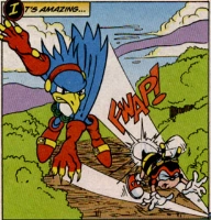 Like the rest of the Fearsome Foursome—Sergeant Simian, Lightning Lynx, and Flying Frog—Predator Hawk debuted as an agent of Mammoth Mogul's, attacking the Chaotix on his orders and specifically countering Charmy Bee's aerial abilities. After being defeated and retreating from this battle, he would return to help Mogul in his bid to claim the Sword of Acorns by pitting the Chaotix and Freedom Fighters against each other. Hawk's purpose involved serving as the substance behind Mogul's illusions of Charmy Bee and Miles "Tails" Prower, which initially had the two groups fighting. When the more level-headed members of each team noticed the errors in these illusions, however, the scheme was blown and Hawk was captured along with his teammates. (SMM, SSS: #1)