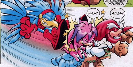 Predator Hawk and his compatriots revealed their true colors soon enough by ambushing and capturing Knuckles the Echidna when he returned to Angel Island and handing him over to the Dark Legion. Following his brainwashing and transformation into Enerjak, the Destructix—now joined by Fiona Fox in place of Rouge—were set to watch over a device created by the Brotherhood of Guardians designed to destroy Enerjak in the event of his return. They were soon challenged by Sonic, Julie-Su, and Locke as they attempted to claim the device, only to be thwarted by Archimedes the Fire Ant; their mission was then rendered unnecessary by Sonic's destruction of the weapon. Unnerved by the ensuing battle between Enerjak and Super Sonic, Predator Hawk and his allies fled through one of Finitevus' Warp Rings, having decided to become full-fledged mercenaries. (StH: #181, #183, #184)
