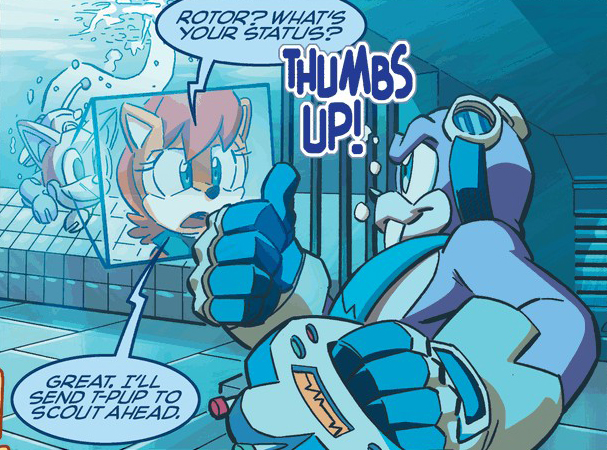 As part of his work on the Sky Patrol, Rotor concealed himself and the mobile base in Soumerca near the abandoned Final Egg. With the other Freedom Fighters off on various missions, he sent a coded transmission to King Acorn, who passed the information on to Sonic and Tails. Arriving with Big the Cat in tow, the pair showed up just as Rotor was being attacked by a Badnik Horde led by Silver Sonic. The four friends handily dispatched the attacking robots, and Rotor greeted his friends warmly. Noting that Sonic and Tails were acting oddly, he questioned them about the situation after giving them a tour of the Sky Patrol, which Tails had named. In response, they handed him NICOLE, who released an energy discharge upon touching Rotor that rekindled his memories of the old reality. Deeply shaken by the knowledge of his previous life, Rotor tried his best to process the matter. He eventually gained enough composure to inform his teammates that Antoine was in Knothole, Bunnie and Sally were on separate deep cover assignments, and Amy had gone missing some time previously. With this information, the duo decided to continue the search for their teammates, leaving Big behind to help Rotor finish the Sky Patrol. (StH: #252, #253)