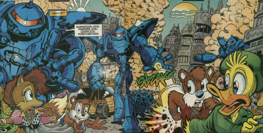 Although Robo-Robotnik's body was destroyed along with his space station, his computer consciousness was transported into the Dr. Eggman style body, which lay a half mile beneath the city of the rechristened Robotropolis. From there, the Shadowbots made a sweep of the city to look for any more Mobians who had not been successfully evacuated to Knothole. When Sonic and the Freedom Fighters re-entered the city in order to plant a computer virus in the city's computer systems, the Shadowbot defence force proved useless against Sonic's abilities. With help from Snively, the computer virus was planted and Dr. Eggman was unable to download the location of Knothole into his memories. Downloading the computer virus instead, Dr. Eggman grew sick each time he attempted to download Knothole's location, using his Shadowbots to help him move around or help him lay down. Shadowbots continued to be used to patrol the city. (StH: #76)