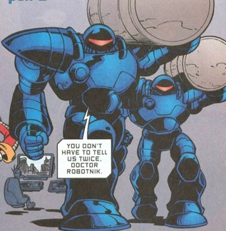 The name Shadowbots can be ascribed to two nearly-identical (and both now defunct) robot armies, one belonging to Dr. Eggman (aka Robo-Robotnik v2.0), and the other belonging to Robo-Robotnik v1.0 (Dr. Eggman's alternate universe counterpart). The Shadowbots first became known to Mobius Prime just prior to the Giant Borg conflict; all the alternate-universe versions of Sonic had gathered to Mobius Prime and Robo-Robotnik 1.0 saw an opportunity to destroy them all at once. Much later, Dr. Eggman (the second alternate universe variant of Robo-Robotnik) brought his own army of Shadowbots upon coming to Mobius Prime when he replaced the recently deceased Dr. Ivo Robotnik (his Mobius Prime counterpart) at the start of the Second Robotnik War. Shadowbots were much taller and slightly more effective than the previous Robotnik's SWATbot models, though were still no match for Sonic the Hedgehog or the Freedom Fighters. Shadowbots were the main force behind Robo-Robotnik's retaking of Robotropolis and securing his empire on Mobius. However, the Shadowbot model was abandoned after they were all but destroyed along with Robotropolis by Station Square's nuclear strike.