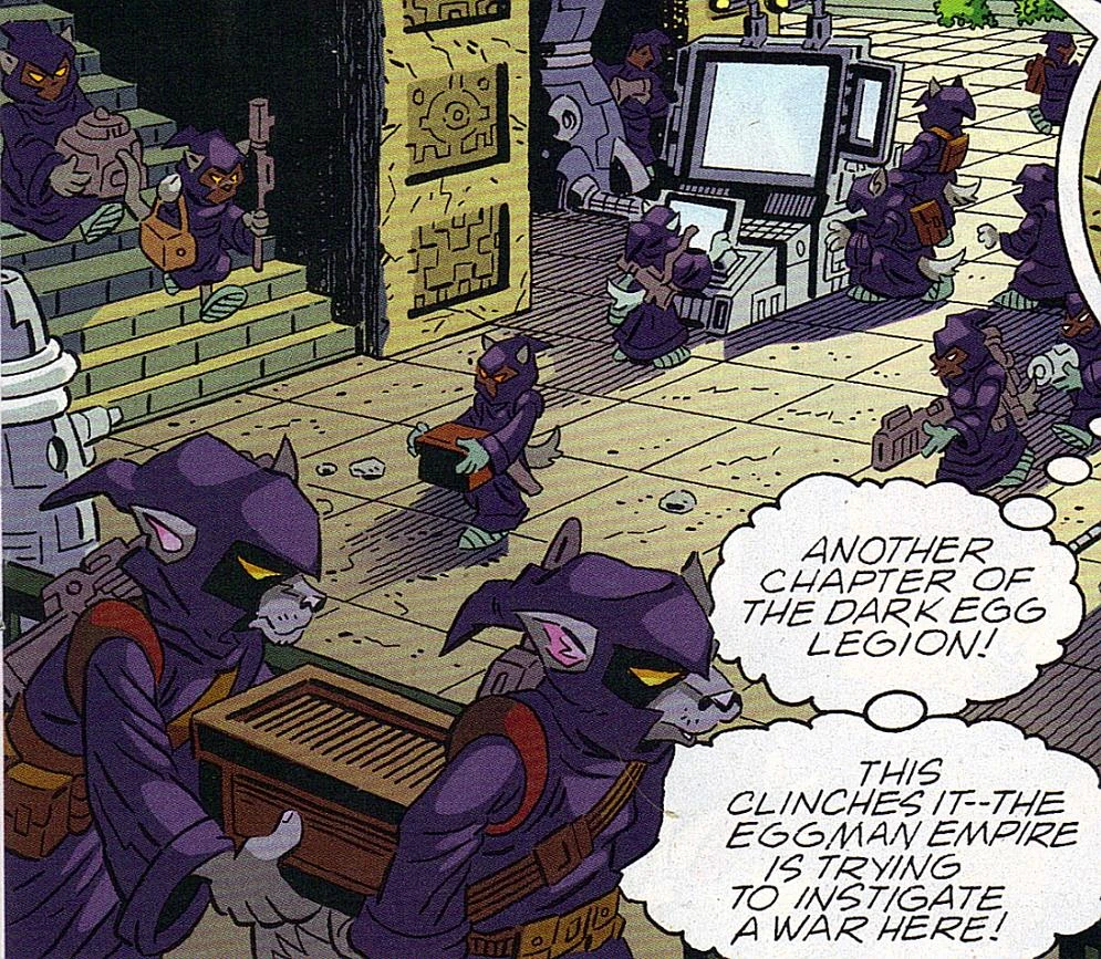 Setting up shop in the Lost Temple of Shazamazon, the Legion continued its efforts to expand Eggman's hold on the region. Their mission was redoubled after they received a false message informing them of Eggman's death, only for the two Grandmasters to be summoned to the Death Egg Mark 2 by the very much alive Eggman. Before returning them and their compatriots to their respective territories, Eggman also ordered them to search for the missing blue Chaos Emerald. Unfortunately, the antagonism of both the Felidae and Wolf Pack hampered the Legion's efforts, and their base was unprepared for the Death Egg's arrival. In order to allow them freedom to work, Eggman dispatched Mecha Sally to capture Grand Chief Lupe and Queen Hathor, knowing that the two societies would blame each other for the disappearance of their monarch. Fortunately, Team Fighters arrived shortly thereafter, and together with members of the Wolf Pack managed to rescue the two rulers and avert a potential war between the Felidae and Wolf Pack. (StH: #237, #238, SU: #37)