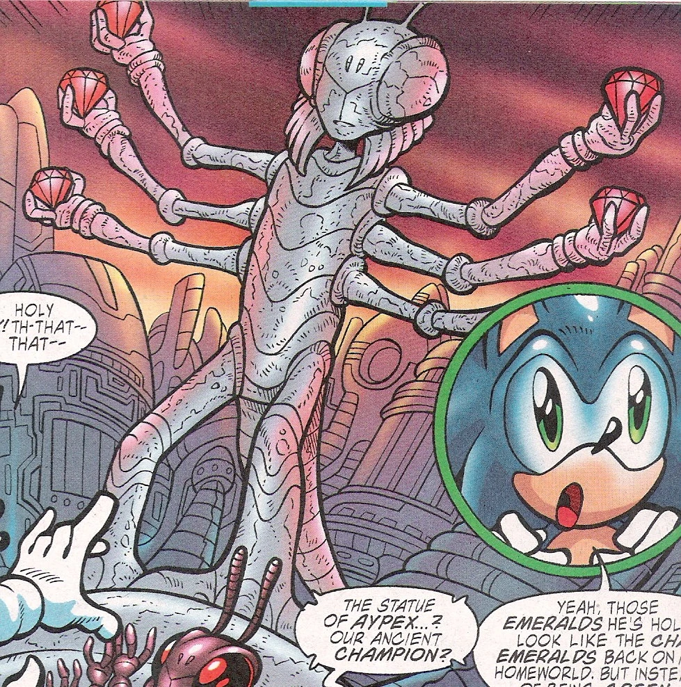 The Statue of Aypex was a statue built on Thoraxia by the friendly inhabitants there, in honor of a hero that saved their race some time ago that held a red Chaos Emerald in each of its six hands. While he was lost in space, Sonic encountered the planet and its inhabitants, and came across the statue when he was exploring their city with Deeble, who served as Sonic's guide. When looking at the statue, he wondered about the link between those red Chaos Emeralds and the green ones back at home. (StH: #126)
