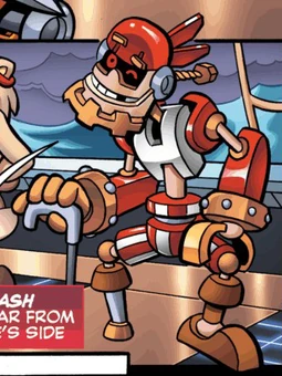 Swash was one of many Sol Zone Pirates who called Pirate Island home, along with his comrade Buckle. The two served under the command of Boltbeard until a strange robot came to the island in a ship that had belonged to robot physician Doc Ratcheturn. The newcomer proved himself a dangerous force by defeating Boltbeard in a duel and destroying him, using his remains to augment his own robotic body. Now known as Captain Metal, the stranger took command of the Pirate Island crew and the Metal Marauder and set about eliminating a number of rival crews. Eventually, his crew came across Mobius natives Bark the Polar Bear and Bean the Dynamite, who joined the crew in gratitude for being rescued from the ocean. Around the same time, the pirates claimed one of the Sol Emeralds, which led them into conflict with Blaze the Cat and the other members of Team Rose aboard the Ocean Tornado. After a fierce sea battle, the pirates sank the attacking vessel and took Blaze captive. (SU: #55, #56)