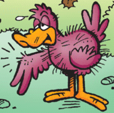 Thorny is an avian mobini resembling a chicken/duck with purple feathers, an orange bill, black eyes, orange legs with two-toed feet, and thin, needle-like spines all over his body.