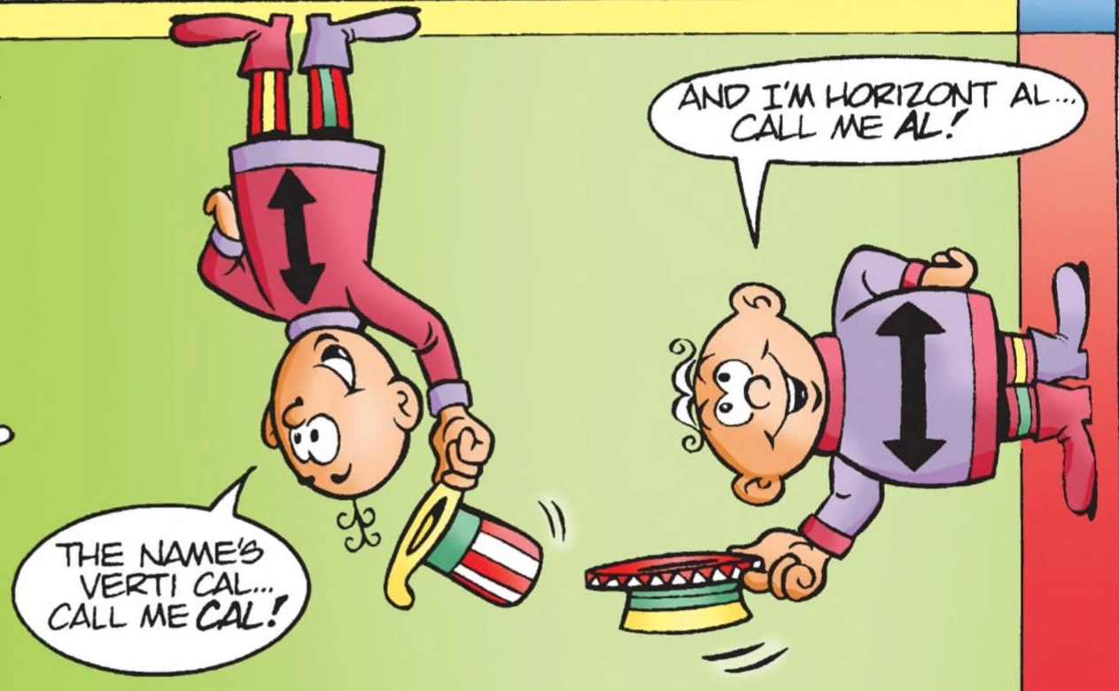 Verti-Cal (Cal for short) is a zone-imp from the Unknown Zone, and the close companion of Horizont-Al. A highly odd being, Verti-Cal was notorious for his fun-loving ways. As one of the two known inhabitants of the Unknown Zone, the other one being Horizont-Al, and with near-omnipotent powers there, the two of them used their powers for their own zany entertainment. After the Omega Wave nearly destroyed their Zone though, the two blamed each other over whose fault it was for allowing that, leading to a devastating war. Eventually, they were arrested by the Zone Cops for endangering other realities and imprisoned in the Zone Jail, where they gained the acquaintance of Scourge the Hedgehog, who ultimately used them to break out of the Zone Jail.