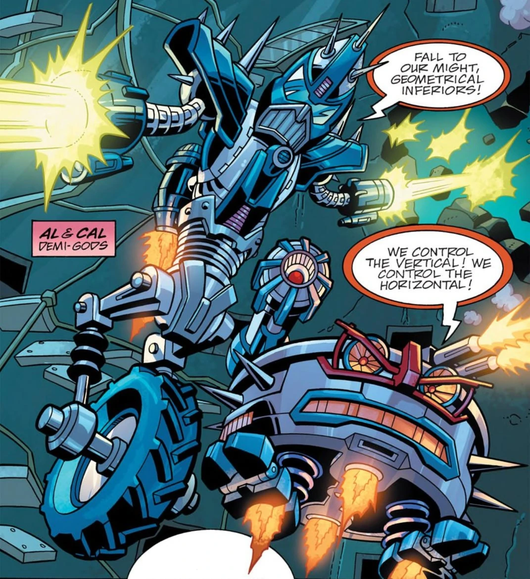 That same evening, the Destructix released all the prisoners and altered the gravity to start a riot, and before they knew what happened, Cal and Al were snatched up by Predator Hawk who then deposited them in front of Scourge. Fearful of what would happen to themselves, the two listened as Scourge pointed out their past kindnesses to him, and his decision to let them get revenge like he was doing. Their desperate protests went unheeded though as Sergeant Simian broke off their Control Collars, causing the shocking reversion back to their powerful demigod forms. Filled with pent up rage, Cal and Al went on a devastating rampage throughout the cell blocks, firing at prisoners and Zone Cops alike in their desire to get back at the "inferiors" that tormented them. However, the Warden soon managed to put a halt to their warpath by targeting them with F.O.E. Inhibitors, which brought them back down to their diminutive statures. Back in control of themselves but helpless, Cal and Al then turned to Scourge, begging him to rescue them, but he cruelly abandoned the two to save himself and fled through a Warp Ring with the Destructix. (SU: #31, #32)