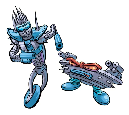In his robotic form, Cal is a tall, spindly being with spiked armor and laser cannons for hands. His eyes are covered by a blue visor resembling googles, and in place of feet, his legs meet together at a wheel in similar fashion to a unicycle.