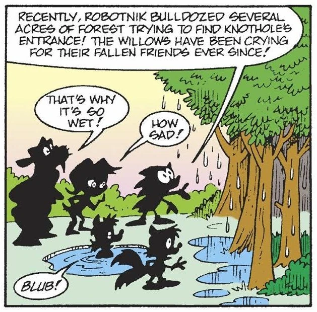 After Dr. Ivo Robotnik had cut down a sizable portion of the Great Forest, the surviving Weeping Willow Trees would "cry" for their fallen friends, causing them to leak so much water that they threatened to flush the Knothole Freedom Fighters and Knothole out of hiding. Fortunately, the Knothole Freedom Fighters made the Weeping Willow Trees stop crying by planting new saplings at the edge of the Great Forest. (OSM: #0)
