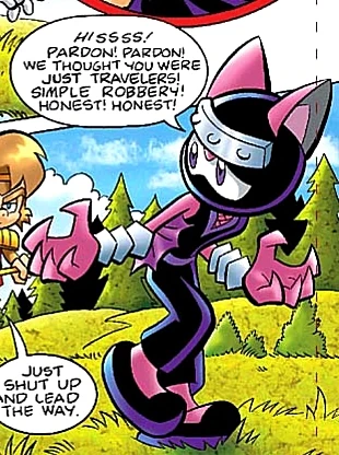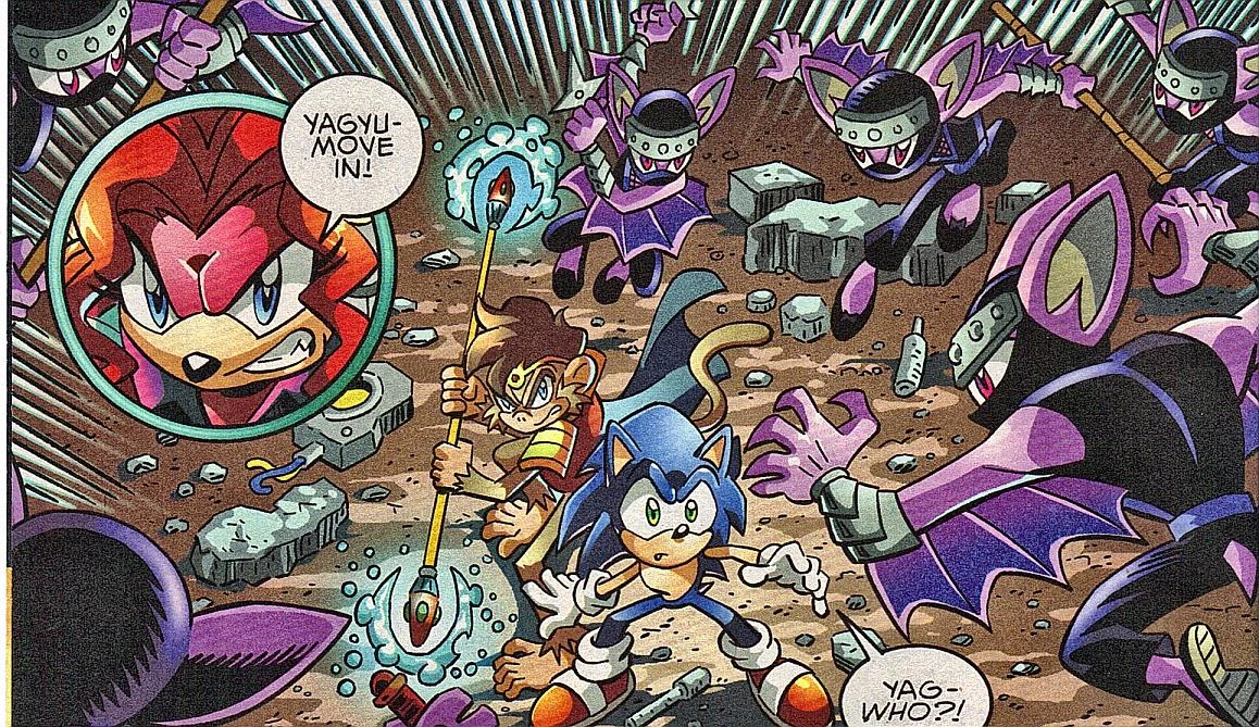 While the Iron Dominion was securing New Mobotropolis, back in the Dragon Kingdom, after Sonic and a team of Mobians—namely Monkey Khan, Tails, and Sally Acorn—who escaped New Mobotropolis convinced the Gossamer Clan to side with Monkey Khan, members of the Yagyu Clan still stationed in their homeland requested a meeting with them. Several of them then attacked the group after mistaking them for ordinary travelers and attempting to rob them, and were handily defeated before being informed of the truth. The Yagyu Lord of that area then agreed to meet with Sally and Khan, while Sonic and Tails ended up dealing with Fiona Fox and members of the Destructix who had entered Yagyu territory. The Lord brushed off many of Sally's negotiating tactics, only agreeing to break away from the Iron Dominion when Khan proposed they leave the clan system altogether and return to the regional lord rule of the past, which appealed greatly to the Lord. Unbeknownst to them, Khan did this because he knew that the Yagyu would be less efficient without the structure the clan system had given them. (SU: #13, #14)