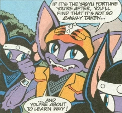 After that the Yagyu guarded the Eggdome alongside the D.E.L up until Eggman`s escape, where they ran, leaped, swung and tumbled out of the mad doctor`s path. Recovering from the escape the Yagyu went after the doctor with their mistress and much of the Dark Egg Legion in pursuit. Catching up to the former despot they found Sonic the Hedgehog and Miles "Tails" Prower. Soon the hedgehog attacked, damaging most of the saucer crafts, harassing the bats until the Iron King dealt with the hedgehog. Once more Freedom Fighters appeared the clan was pushed slightly back before their mistress rallied them for another charge. Following the heroes to the city limits where they came to a halt, unable to penetrate the shield the Yagyu along their mistress, king and allies were forced to take a humiliating retreat and walk all the way back to the Eggdome. However, they would soon return and invade the city, aided by the reprogrammed "Iron NICOLE". Though a few rebels were able to escape, the Yagyu were able to capture many of the citizens, and forced them to play audience for a public Legionization to be held in the city's coliseum. (StH: #205, #206, #208, #209, #210)